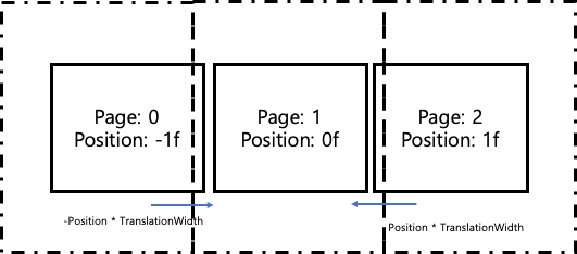 그 다음은 setPageTransformer 함수를 사용하는 것이다. 이 콜백은 현재 포커싱된 page 뷰 객체를 받을 수 있고 각 page 별로 포커싱 된 페이지로부터 얼마만큼 떨어져 있는지 비율 정보를 position으로 받을 수 있다. 아래 그림에선 현재 페이지가 1번에 포커싱돼 있어서 이전 페이지인 0번 페이지는 -1f만큼 떨어져 있게 되고, 다음 페이지인 2번 페이지는 1f만큼 떨어져 있게 된다.