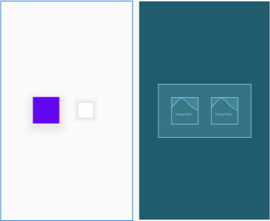elevation을 이용한 방법과 차이가 있다면 이 방법은 그림자 영역이 뷰의 영역에 포함되어 있다는 것이다. 아래 그림을 보면 왼쪽 그림의 보라색 사각형이 elevation을 이용해서 그림자 효과를 준 경우고 하얀색 사각형이 리소스를 이용해서 그림자 효과를 준 경우인데, 미리보기 상으로는 하얀색 사각형이 더 작아보이지만 두 ImageView의 가로 세로 너비 값은 오른쪽 그림에서도 알 수 있듯이 동일하다. 리소스를 사용하면 그림자 영역을 View 내부에서 사용하기 때문에 원래 생각했던 ImageView의 크기와 약간 차이가 발생 할 수 있다. 상황에 따라서 단점이 될 수도 있고 장점이 될 수 도 있는 기능이라 섣불리 판단 할 수는 없을 것 같다. 단 차이점은 유의해서 알고가는 것이 좋을 것 같다.