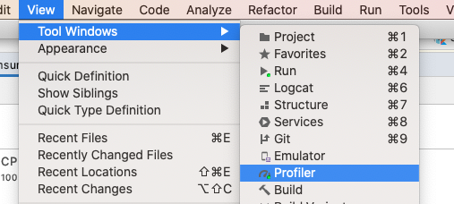 View -> Tool Windows -> Profiler 로 Profiler를 실행한다.