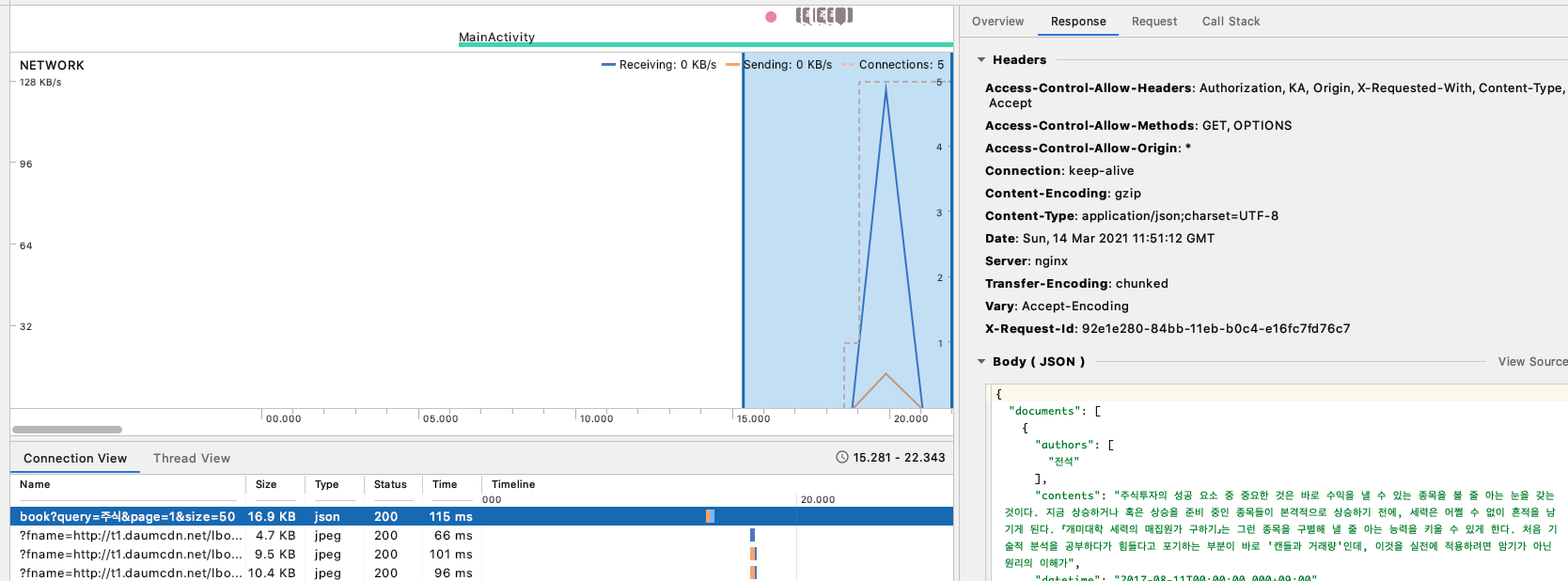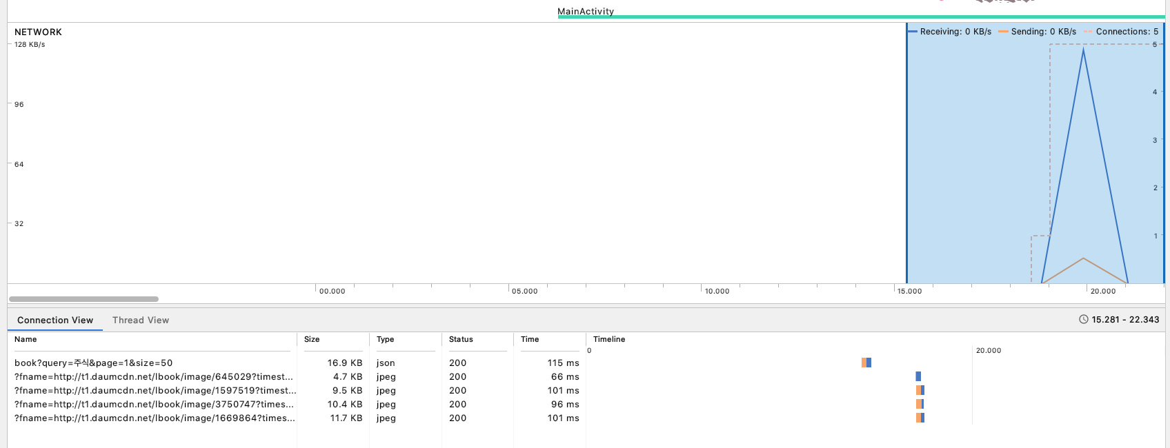 그래프에서 네트워크를 선택하고 앱에서 네트워크 요청을 보내보면 아래 그림처럼 파란 직선 그려진 트래픽을 볼 수 있다. 마우스를 이용해 파란색 직선 영역을 블록처리해보면 해당 구간에서 주고 받은 네트워크 요청 목록을 볼 수 있다.