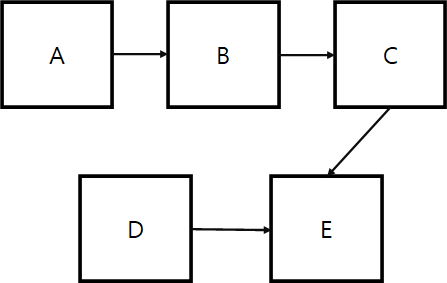 그림 2 그림 2는 그림 1의 결합도 문제를 해결한 설계다. E에 의존했던 A,B 는 구조를 변경해 E를 참조하지 않아도 되게끔 수정했다. 또한 A와 D 간의 의존관계도 수정했다. 이전보다 의존 관계가 많이 줄었으므로 결합도가 낮아진 것으로 볼 수 있다.