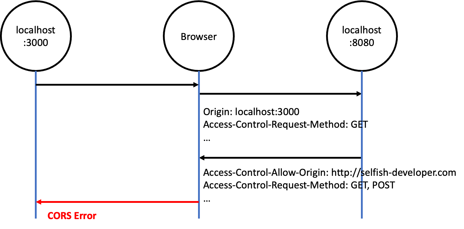 같은 Origin상에서는 요청이 오는 곳과 처리하는 곳이 동일하기 때문에 특별히 보안상 처리해줄 이유가 없다. 그런데 다른 Origin에서 오는 요청이라면 내가 요청으로 받아온 결과를 믿을만한지 그렇지 않은지 검증하는 과정이 필요하다. 브라우저에서는 결과의 헤더 값을 통해 CORS를 확인한다. 한번 쯤은 봤을 법한 'Access-Control-Allow-Origin', 'Access-Control-Allow-Methods' 가 브라우저에서 CORS를 검증할 때 사용하는 값이다.