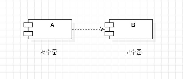 다이어그램 상에선 컴포넌트A 가 컴포넌트B를 가리키고 있는 그림인데 소프트웨어상에선 컴포넌트A 가 컴포넌트B 에 의존한다는 의미의 그림이다. 이 의존 관계는 소프트웨어 상에서 생길 수 있는 가장 중요한 관계고 이 관계를 어떻게 정의하느냐에 따라서 소프트웨어의 아키텍처가 결정된다. 컴포넌트A는 저수준으로, 컴포넌트B는 고수준으로 둬야한다고 그림상에선 표현 했는데 여기서 말하는 수준은 어떤 컴포넌트가 우월한지를 결정하는 기준이 아니라 얼마만큼 변동성이 크냐를 기준으로 결정한다.