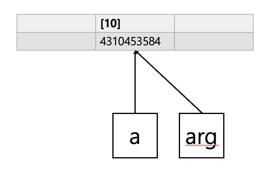 add_array 함수 안에 있는 배열 arg 는 내부에서 더하기 연산을 해도 기존과 동일한 주소를 가르키고 객체의 값을 변경시킨다. 그래서 원래는 빈 배열만 있었던 메모리가 [10] 으로 바뀌게 된다