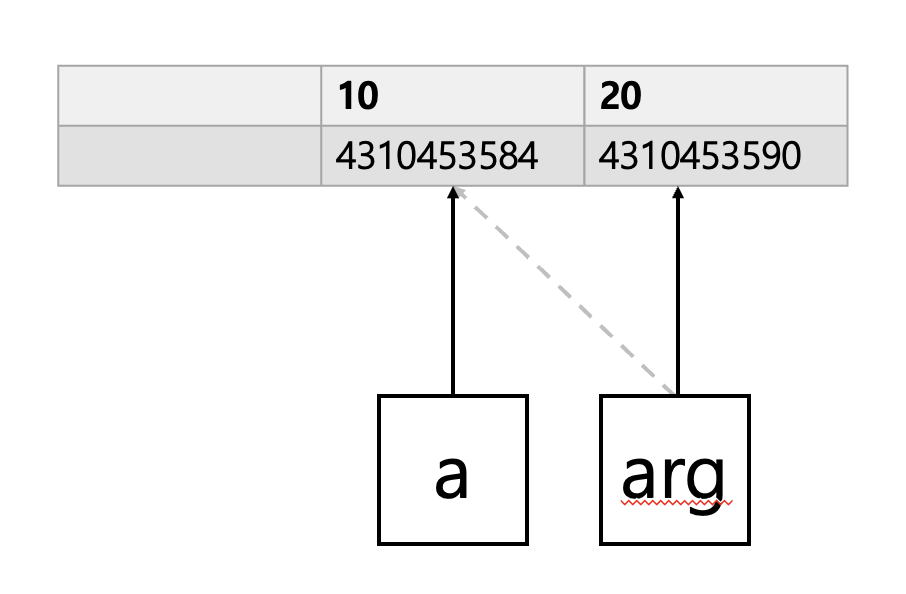 add_int 함수 안에서 함수의 인자 arg 는 10의 주소를 가르키고 있지만 10을 더하면서 다른 주소를 가르키게 된다. a 와 arg 각각이 다른 주소를 참조하고 있기 때문에 결과 값이 다르다.