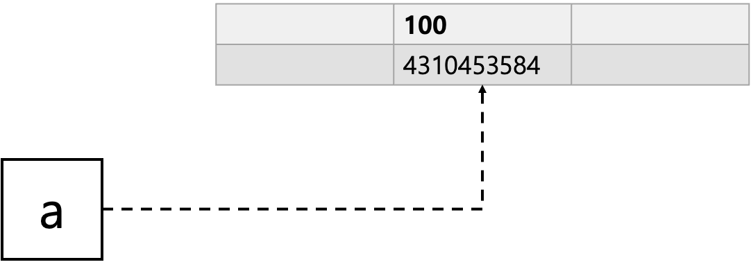 예를 들어 아래코드 변수 a 는 100 이라는 객체의 위치 값을 가르키고 있기 때문에 100 이라는 값을 출력한다. id 라는 함수를 이용해서 객체의 주소지를 확인할 수 있는데 아래 코드처럼 100 의 주소값과 변수 a 의 주소값이 동일하다.