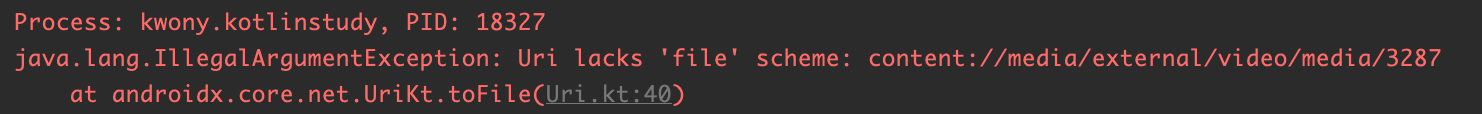 문제는 File 클래스를 선언해야하는 경우다. 오래된 오픈소스거나 Uri를 고려하지 않은 모듈인 경우엔 절대 경로가 필요한 File 클래스를 사용해야하는 경우가 종종 있다. 그런데 앞서 언급했듯이 Uri는 상대 경로다. Uri를 통해 File 클래스로 바꿀수 있긴 한데 이건 file 스키마를 가진 Uri인 경우에만 그렇다. Uri 클래스에 Kotlin에 확장 코드로 toFile() 함수가 있긴 한데 ContentUris로 얻어온 Uri 클래스에 쓰면 요런 에러가 뜬다.