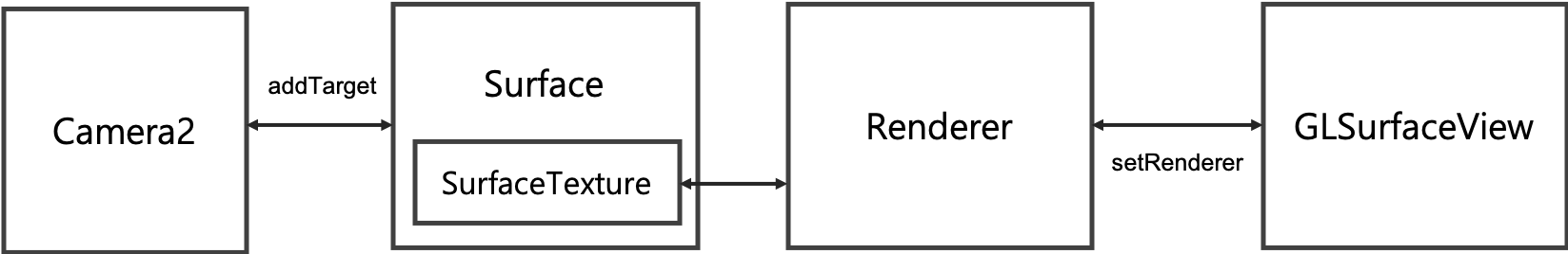 Camera 2에서는 Surface 클래스의 형태로 카메라에서 보고 있는 이미지를 전달받을 수 있다. 앞서 Renderer에서 외부로부터 이미지를 받을 공간을 SurfaceTexture로 선언했는데 카메라의 이 클래스를 이용해 Surface를 만들면 카메라로부터 이미지를 전달받고 미리보기로 보여줄 수 있게 된다.