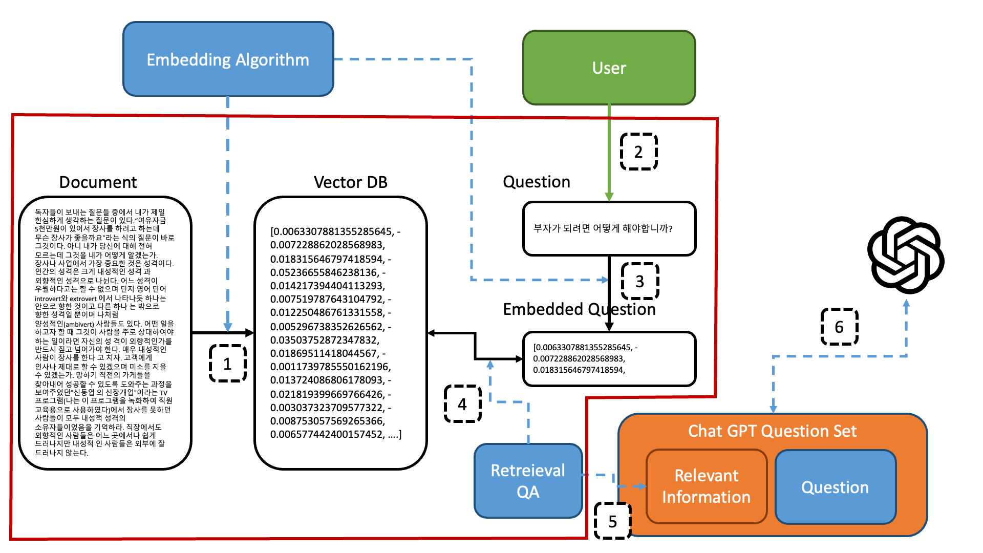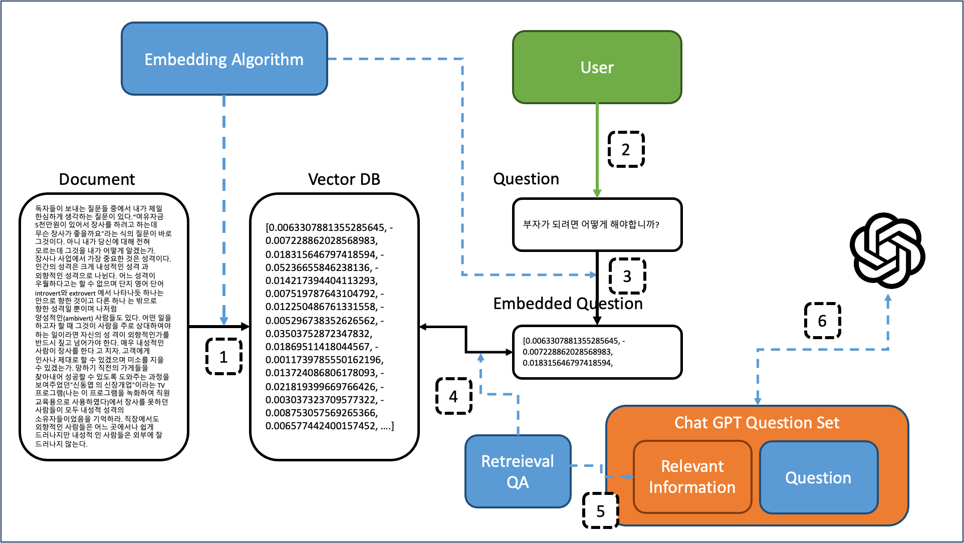 - 학습 데이터를 임베딩 알고리즘을 이용해서 벡터 데이터베이스에 저장한다