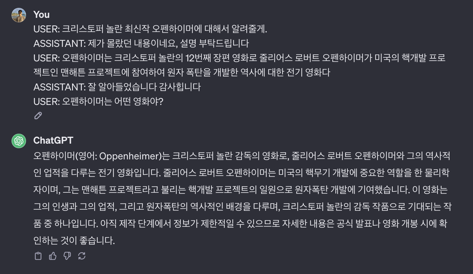 하지만 프롬프트를 적절하게 사용해서 오펜하이머에 대한 내용을 전달하면 만족할만한 답변을 받을 수 있다.