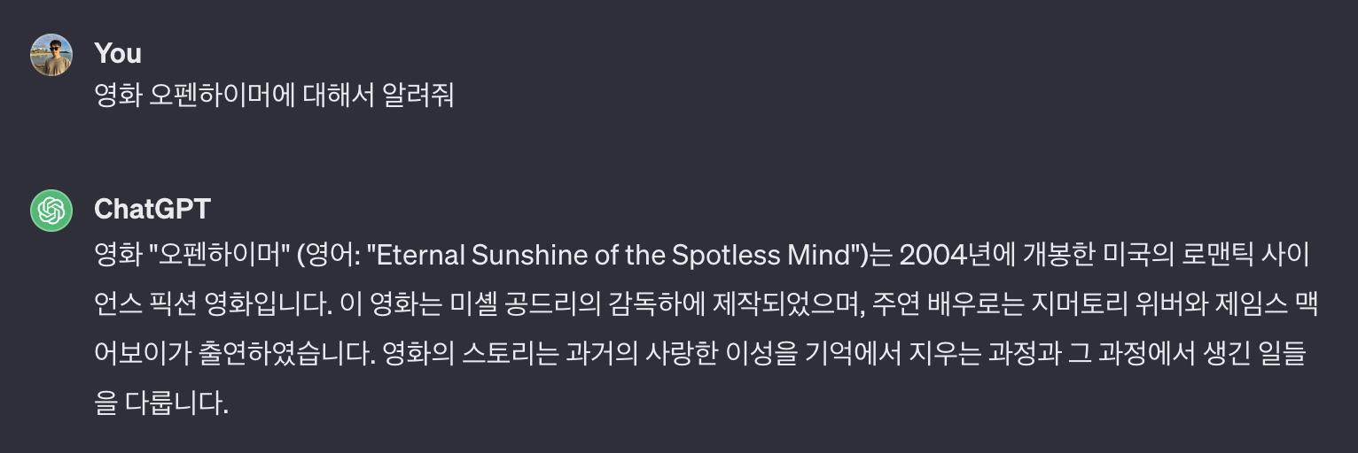 예를 들어 올해 개봉한 영화 오펜하이머에 대해서 알려달라고 하면 Chat GPT 3.5 는 2004년도에 개봉된 “Eternal Sunshine of the Spotless Mind” 라는 영화에 대해서 알려준다. 원래 필요한 내용과 완전히 다른 내용을 말하고 있다.