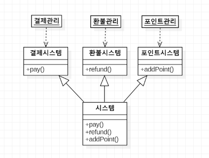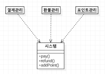 위 그림을 보면 결제관리, 환불관리, 포인트 관리 객체가 시스템 클래스를 참조하고 있다. 그런데 결제관리 객체는 pay 함수만 호출 할 것이고, 환불 관리는 refund, 포인트관리는 addPoint함수만 사용할 것이다. 각 객체의 입장에서는 필요 이상으로 시스템 클래스에 의존하고 있는 형태다. 만약 객체에서 불필요하게 다른 함수를 호출한다면 에러가 발생할 위험도 있다.