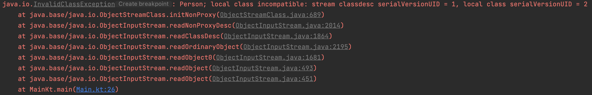 data class Person(val name: String, val age: Int, val gender: Int) : Serializable { companion object { private const val serialVersionUID: Long = 2L } }그 결과 serial version 이 맞지 않는다는 에러를 띄운다. 버전 정보를 활용해서 직렬화를 관리하면 될 것 같다.