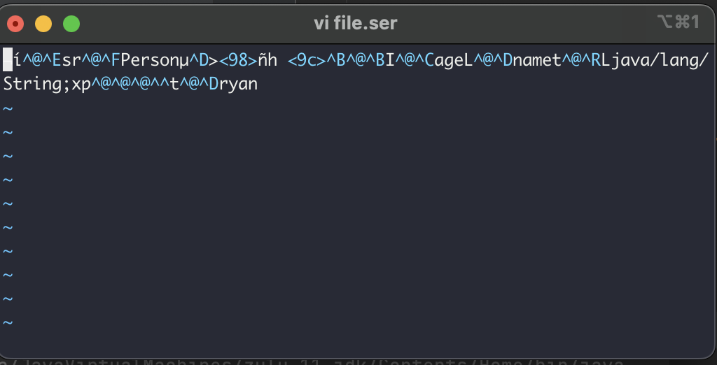 data class Person(val name: String, val age: Int) : Serializable try { val person = Person(name = "ryan", age = 30) val fileOut = FileOutputStream("file.ser") val objOut = ObjectOutputStream(fileOut) objOut.writeObject(person) objOut.close() fileOut.close() } catch (e: IOException) { e.printStackTrace() }그러면 file.ser 이라는 파일이 생성된다. vim 에디터를 통해서 열어보면 Person의 정보가 바이트로 입력되어있다.