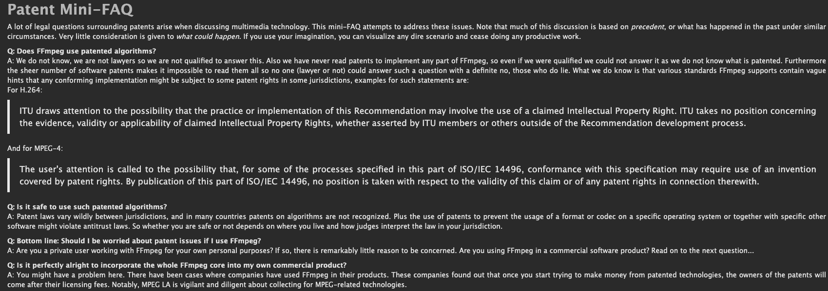 ffmpeg 공식 홈페이지 Patent issue에 대한 답변. "We do not know" 문구가 눈에 띈다. 1. MediaCodec - 어쩔 수 없이 써야하는 존재