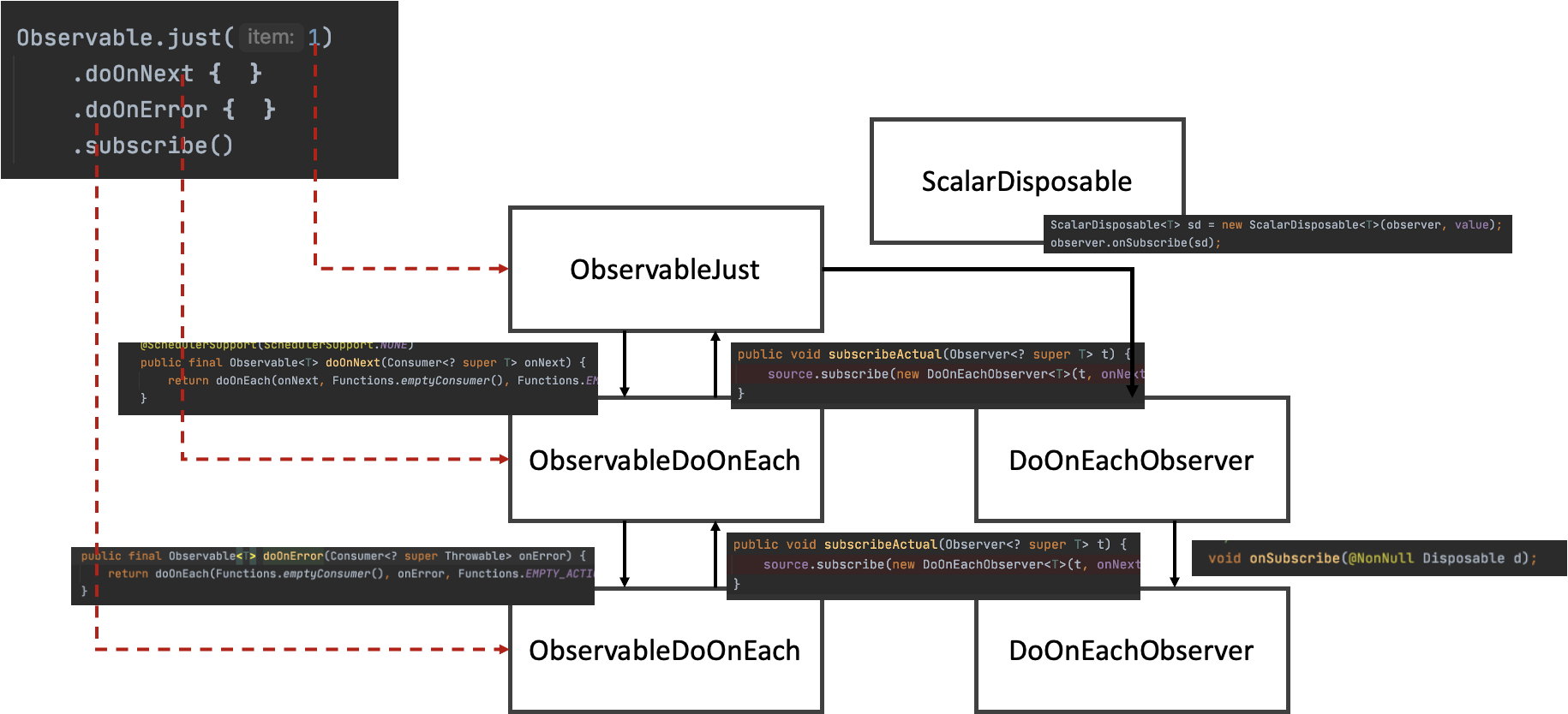 구체적으로 설명하기 위해 짧은 RxJava 코드 실행시 생성되는 객체들의 연관관계를 그려봤다.