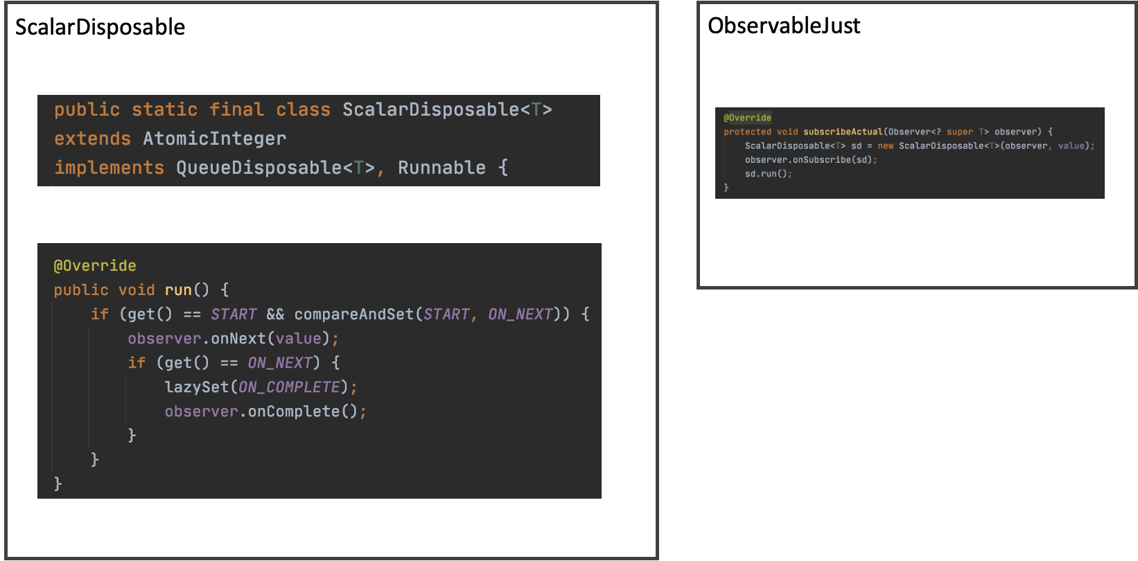 Disposable 객체는 Observable에서 노출할 자원을 갖고 있고 Observer에게 이벤트로 전달하는 객체다. 그래서 RxJava 내부 소스코드를 분석해보면 첫번째 그림에 보여진 Observabe -> Observer에서 호출되는 함수는 사실 Disposable를 구현한 클래스 객체 내부에서 호출되고 있다. Observable은 Disposable을 생성하기 전까지 스트림을 대신 관리해주는 클래스고 실질적으로 값을 보내는 작업은 Disposable 내부 클래스에서 실행되고 있다.