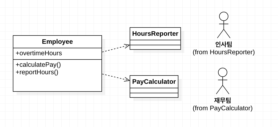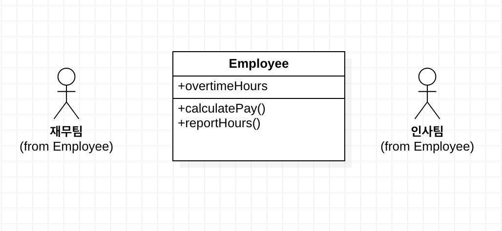 위 그림 상에의 Employee 클래스는 초과근무 시간(overtimeHours)을 속성으로 갖고 있고 재무팀에선 이 정보를 이용해 초과근무 수당을 계산하는 함수를(calculatePay) 관리하고, 인사팀에서는 허위로 초과근무 시간을 채우는 사람이 없는지 감시하고자 초과근무 시간을 보고하는 함수(reportHours)를 관리하고 있다. 두개의 액터가 하나의 클래스를 변경 할 수 있는 요인이기 때문에 이미 SRP원칙을 어긴 구조다.
