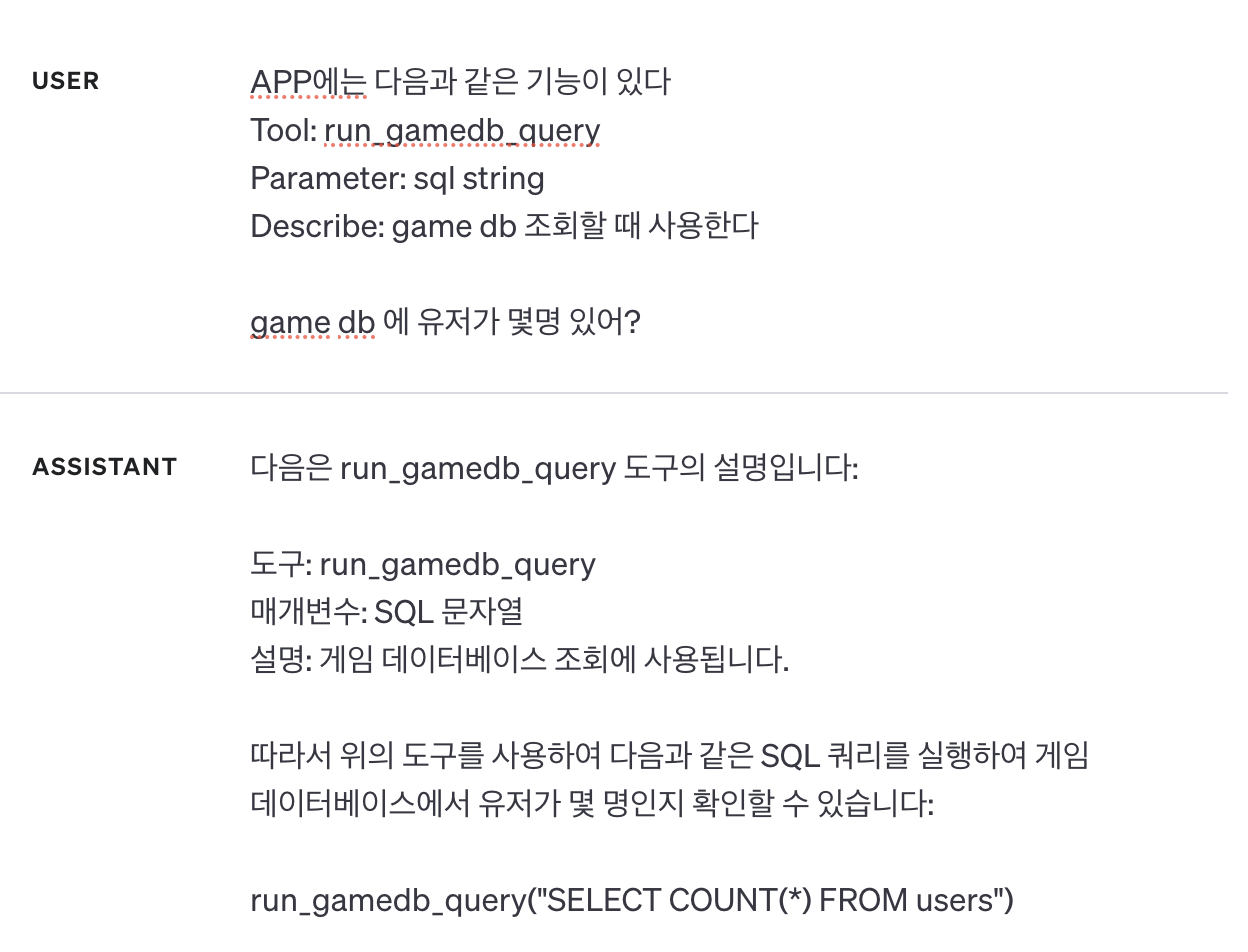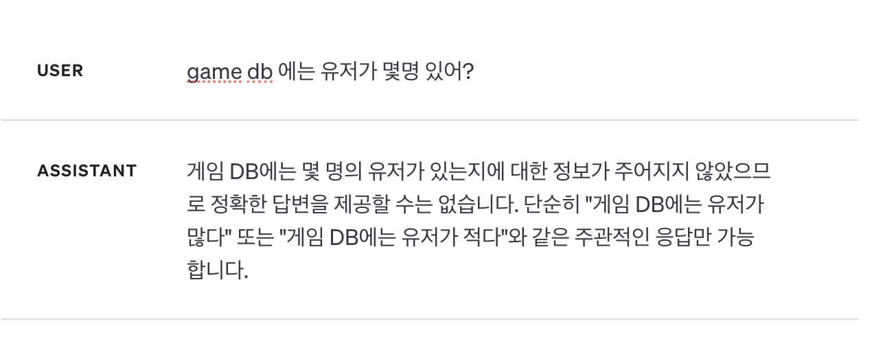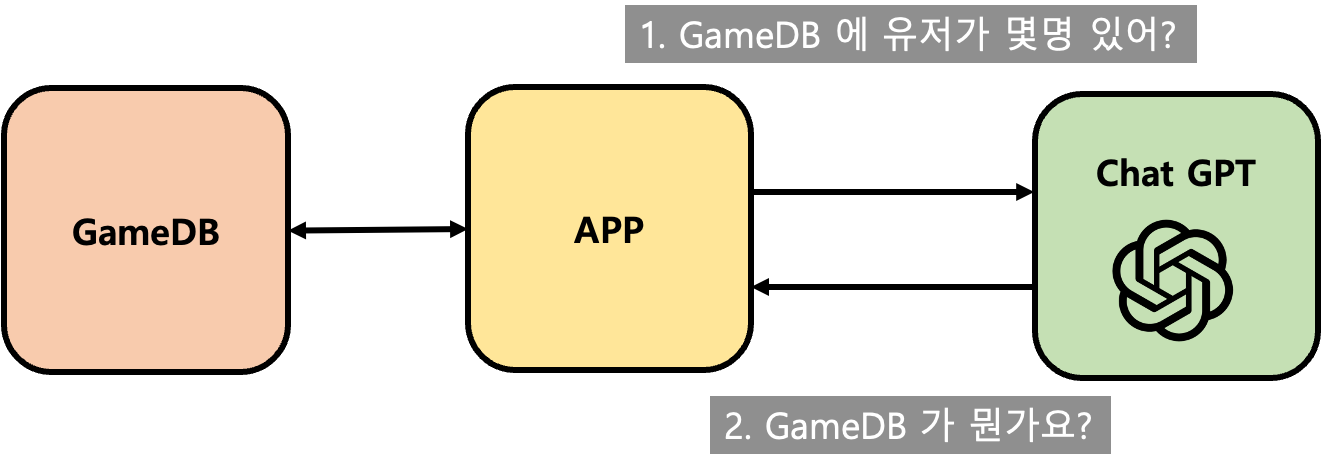 그런데 요청이 오픈된 데이터가 아니라면 어떨까? 위의 그림처럼 APP 에서 GameDB 에 유저가 몇명 있냐고 물어보자. 그러면 Chat GPT는 GameDB 가 뭔지 모르기 때문에 답변할 수 없다.