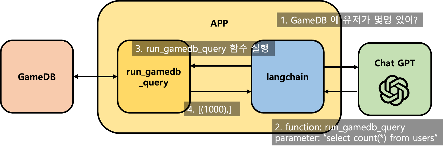 LangChain 에 run_gamedb_query 함수를 툴로 추가하고 Chat GPT 로 부터 해당 함수를 실행하라는 답변을 받으면 자동으로 함수를 실행한다.