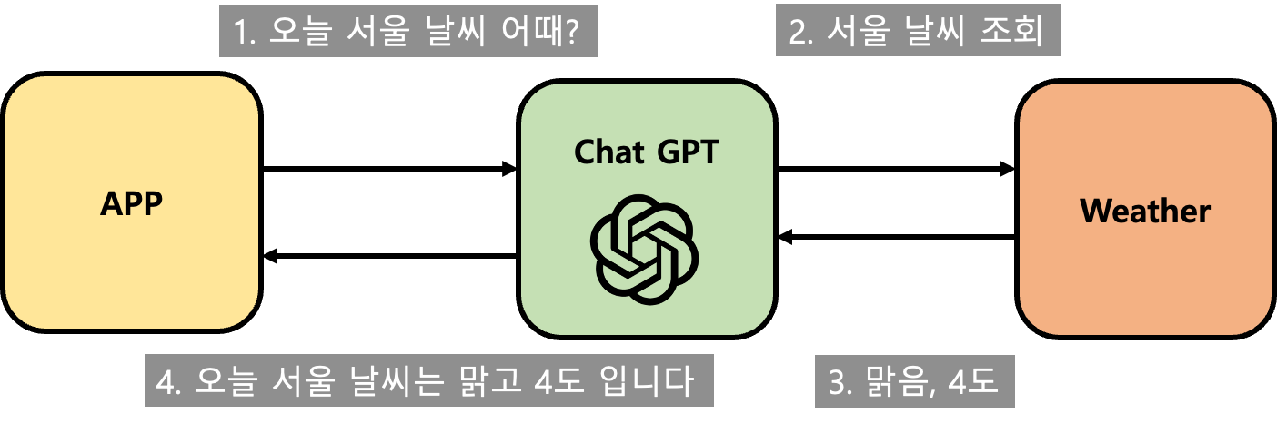 로직을 다이어그램으로 그려보면 위와 같다. APP 에서 받은 질문으로 외부에 날씨 API 를 조회하고 답변하는 식이다.
