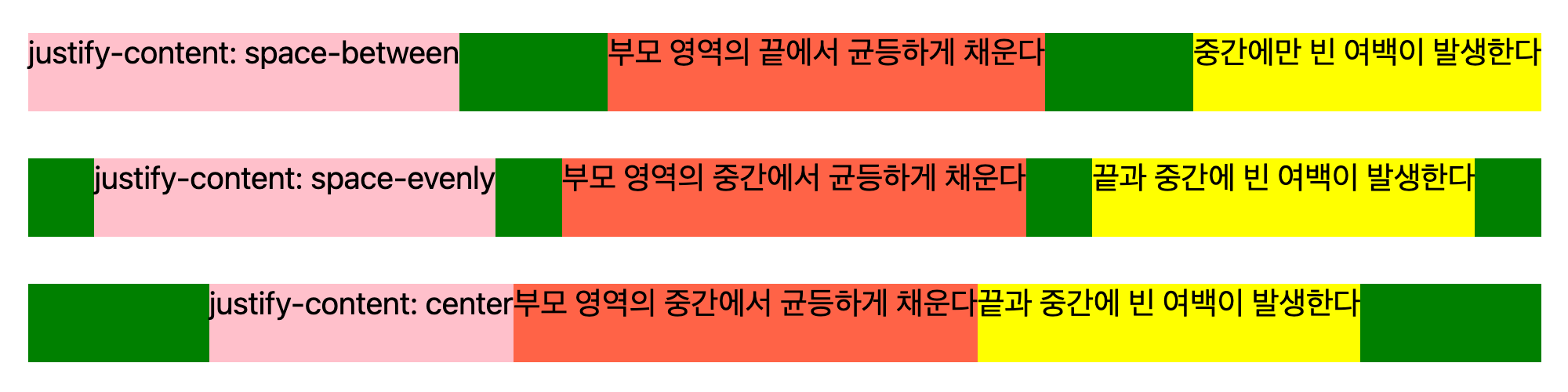 justify-content는 메인축 방향으로 아이템을 정렬하는 방법을 설정한다. 값에 따라서 배치 방식이 다른데 이건 글로 쓰는 것 보다는 그림으로 보는 것이 훨씬 쉬울 것 같다. 기본 값은 flex-start다.