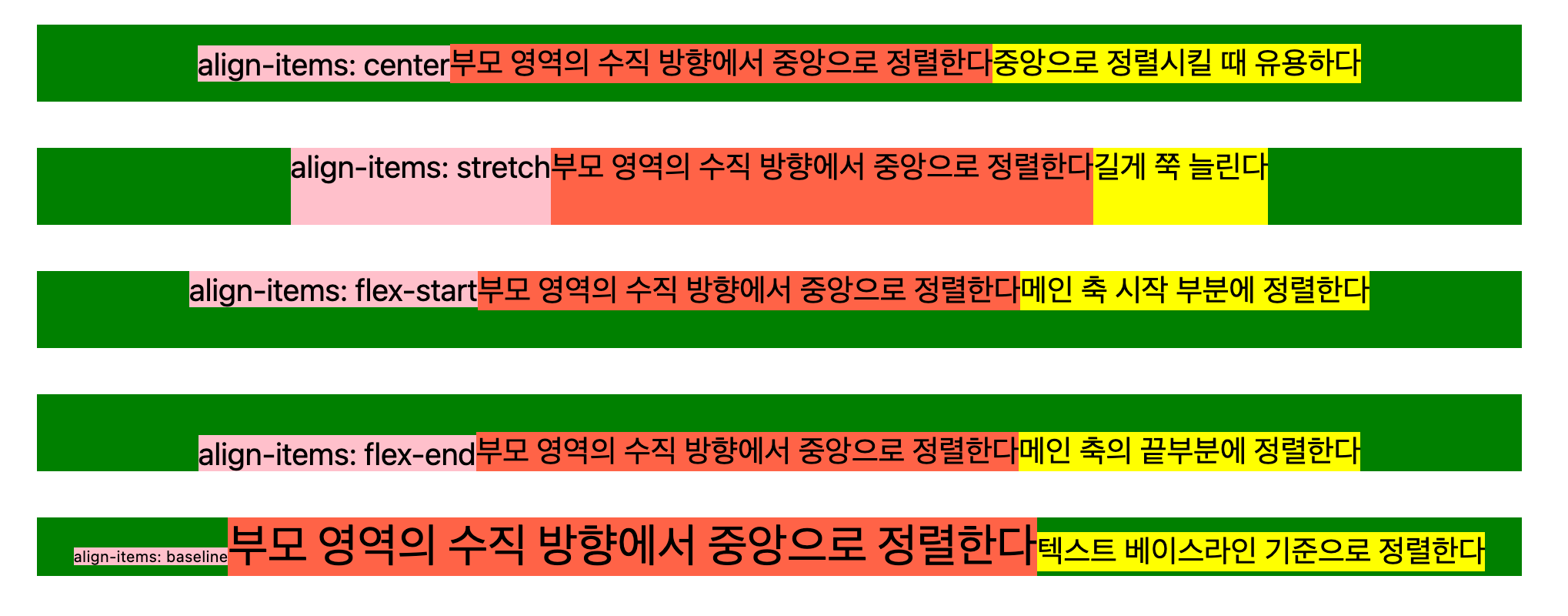 flex 아이템의 수직 정렬을 설정하는 방법이다. center의 경우 가운데 정렬이며, stretch는 부모 영역에 맞춰 height를 쭉 늘린다. flex-start, flex-end 는 메인 축 기준으로 시작점 또는 끝부분에 정렬한다. baseline은 텍스트 베이스라인 기준으로 정렬하는 방법이다.