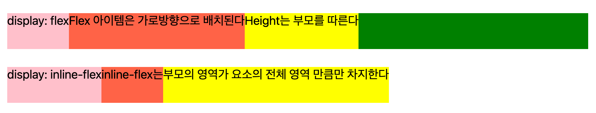 flex로 선언된 요소는 부모의 width를 전부 차지하고 내부에 속한 요소는 가로로 정렬된다. inline-flex 로 선언된 요소는 자식 요소가 차지하는 width 만큼만 공간을 차지한다.