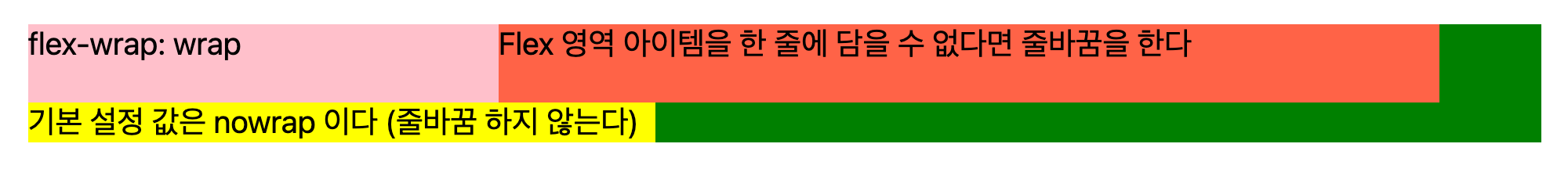flex-wrap으로 내부 요소의 width의 총합이 컨테이너 width를 초과하는 경우 어떻게 배치할 것인지 정할 수 있더. wrap으로 설정된 경우에는 줄바꿈을 한다. 기본 설정 값은 nowrap이고 비율에 따라서 배치한다.