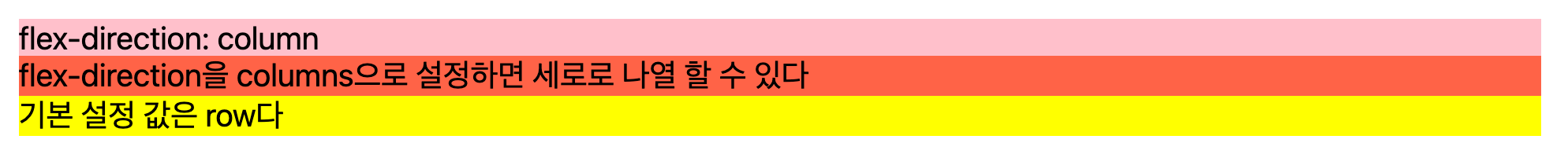 flex-direction 값을 설정하면 세로로도 정렬할 수 있다. 크게 row, column 으로 나뉘어 있고 row 인 경우에는 가로, column 인 경우에는 세로다. 이외에도 row-reverse, column-reverse가 있으며 역순으로 배치 할 수 있다.