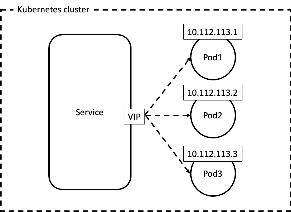 쿠버네테스 상에선 서비스를 클러스터 네트워크에서 노출되는 Pod의 논리적인 집합으로 정의한다. 클러스터상에 존재하는 Pod은 selector를 통해 연결하고자 하는 고유의 서비스를 설정할 수 있고, 서비스는 연결된 Pod을 End Point로 둔다. 서비스는 고유의 VIP를 갖고 있기 때문에 클러스터 상에선 서비스를 이용해 내부 Pod에 접근할 수 있게 되며 연결된 Pod이 여러개 있는 경우 서비스는 부하 분산도 같이 담당하게 된다. 리버스 프록시의 역할과 로드밸런서의 역할을 한다.