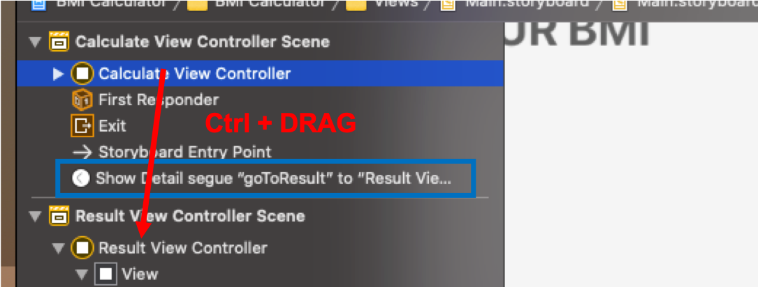 스토리보드에서 화면 전환에 대해서 정의한 후 ViewController에선 앞서 정의한 액션을 호출하는 역할을 한다. 아래 코드를 보면 calculatePressed 라고 스토리보드에 바인딩된 함수에서 performSegue 함수를 호출한다. 이때 withIdentifier에 들어가는 인자를 보면 아까 스토리보드에서 정의한 identifier와 동일한 값이 들어가있는걸 볼 수 있다. identifier 값을 확인해서 어떤 세그웨이를 사용할 지 선택하는 것이다.