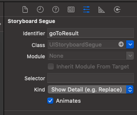 스토리보드에서 화면 전환에 대해서 정의한 후 ViewController에선 앞서 정의한 액션을 호출하는 역할을 한다. 아래 코드를 보면 calculatePressed 라고 스토리보드에 바인딩된 함수에서 performSegue 함수를 호출한다. 이때 withIdentifier에 들어가는 인자를 보면 아까 스토리보드에서 정의한 identifier와 동일한 값이 들어가있는걸 볼 수 있다. identifier 값을 확인해서 어떤 세그웨이를 사용할 지 선택하는 것이다.