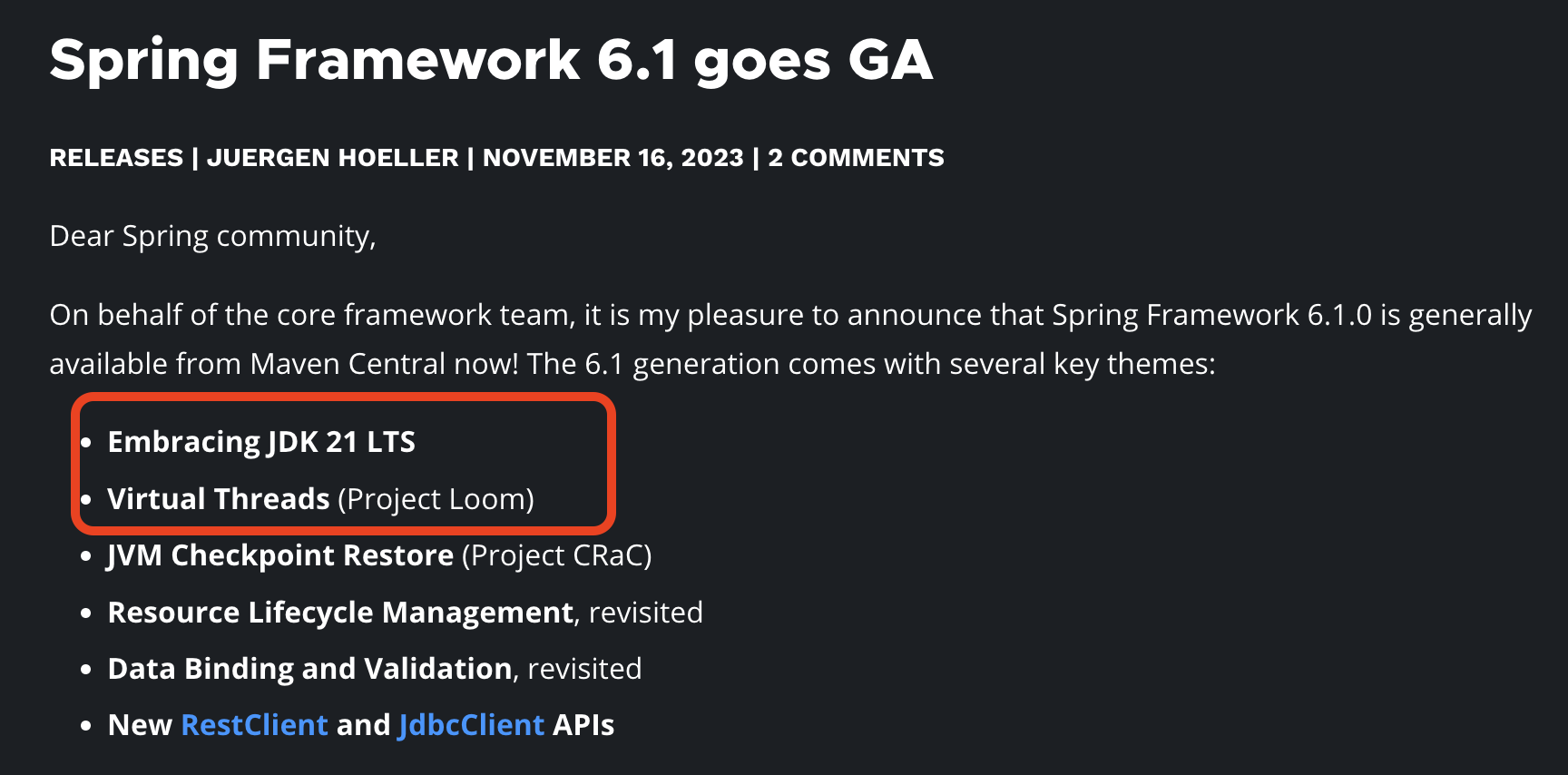 스프링에서는 가상 스레드를 사용해서 위와 같은 단점을 보완하려하고 있다. 11월 16일에 공개된 스프링 블로그 포스트에선 스프링 6.1 버전에서 JDK 21 버전을 채택하고 Virtual Threads 를 사용한다고 했다.