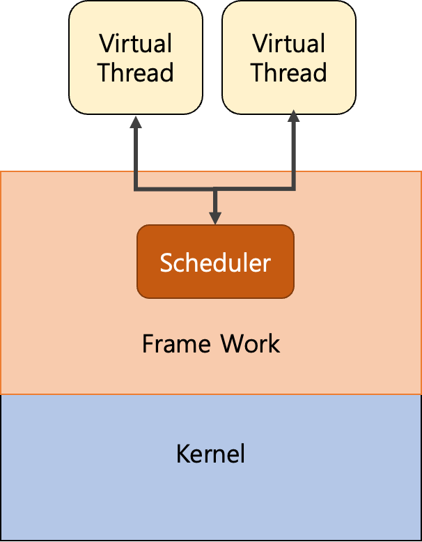 프로그래밍 언어나 라이브러리에서 구현된 추상화된 스레드다. 즉 가상스레드를 만들어도 어디까지나 프레임워크 단에서만 스레드로 정의되며 운영체제에선 이것을 스레드로 인식하지 않는다.