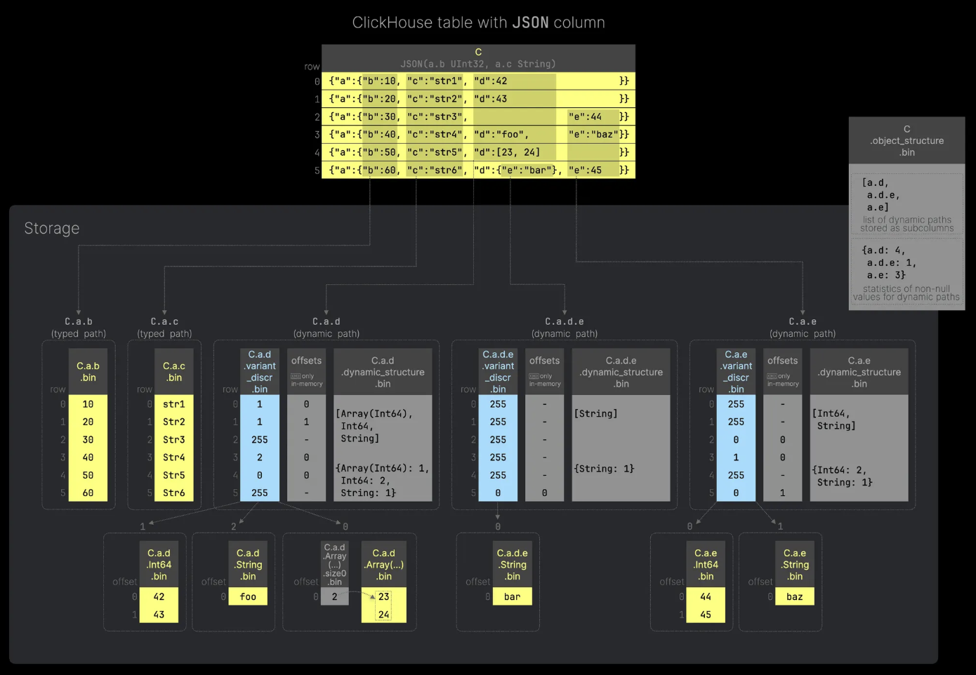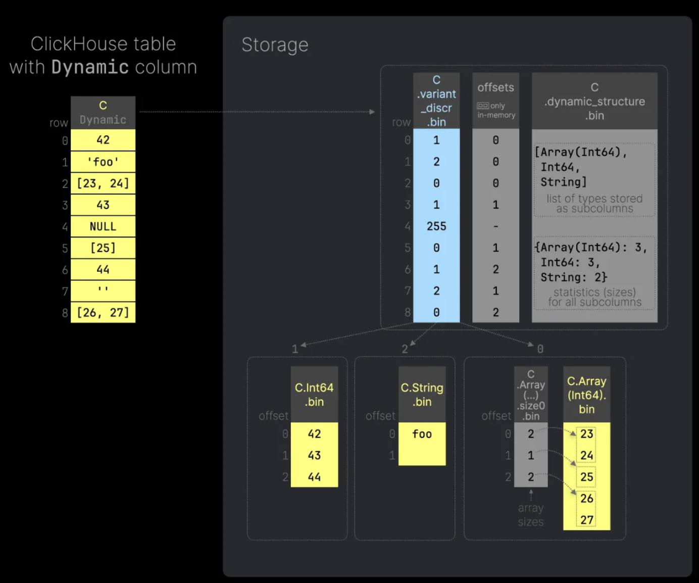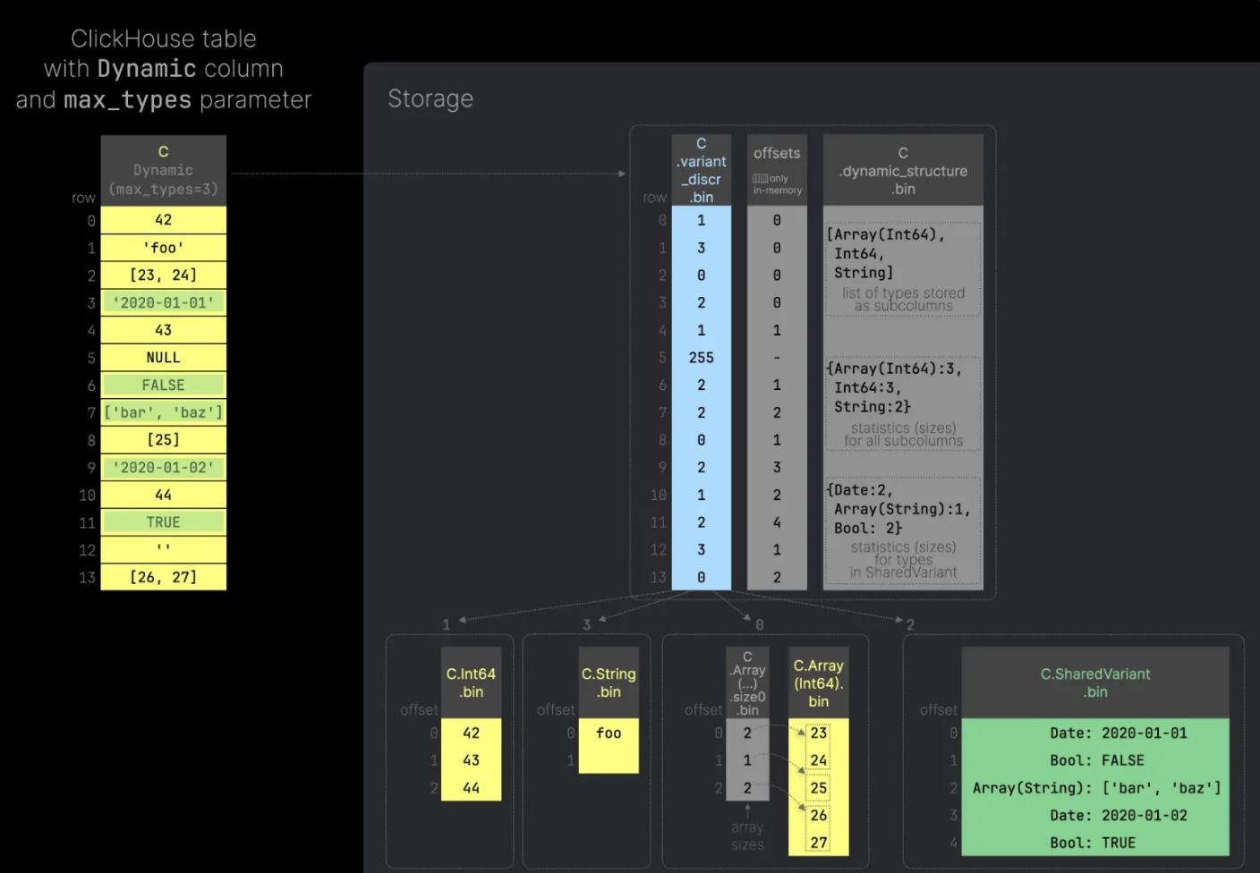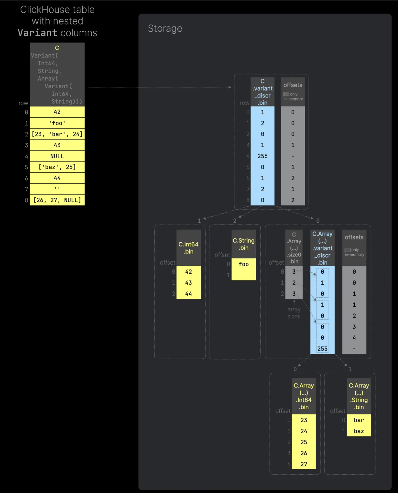 Variant Type 은 하나의 칼럼으로 보이지만 실제로 저장될 때는 같은 데이터 타입인 값들 끼리 별도의 서브 칼럼 형태로 저장된다. 위의 예시에서 C.Int64 는 정수형 데이터, C.string 은 문자열이 저장되는 방식이다.
