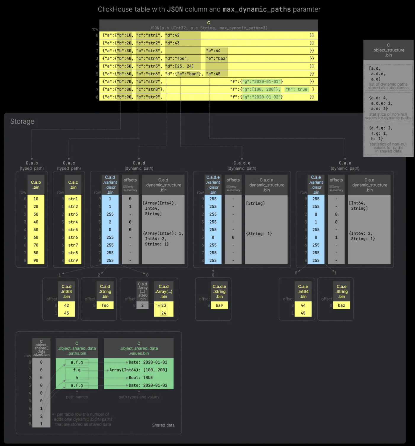 a.b, a.c path 의 경우에는 타입힌트로 분류되었기 때문에 별도의 서브 칼럼으로 저장된다. a.d, a.d, a.e 의 경우에는 타입 힌트로 분류되지 않았으나 현재 칼럼이 max_dynamic_paths 조건을 초과하지 않았기 때문에 서브 칼럼으로 분류가 됐다.