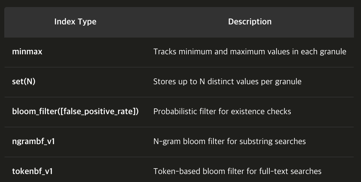 대신 클릭하우스에선 skip 인덱스라는 걸 사용해서 불필요한 데이터 chunk 를 읽지 않아도 되는 방식을 제공한다. 각 구조마다 Skip 인덱스 표시가 되어 있어서 청크 단위로 읽지 않아도 되는 데이터를 표시를 해준다.