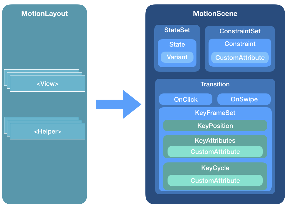 ConstarintLayout의 확장 기능으로 도입된 만큼 MotionLayout은 ConstraintLayout의 일부 요소들을 상속 받고 있다. 아래 그림에서 MotionLayout 의 기본 요소인 MotionScene이 ConstraintSet의 속성들을 포함하고 있는 것을 볼 수 있다. 실제 코드에서는 이 요소를 활용해 ConstraintLayout 내부의 객체들의 효과를 주는 일을 한다. 그 아래 Transition 속성을 보면 OnClick과 OnSwipe가 있는데 이는 클릭과 스와이프 인터랙션에 대해서 콜백을 줄 수 있는 것으로 이해하면 된다. 이 글에서는 MotionLayout은 ConstraintLayout 의 속성들을 이용해 애니메이션 할 수 있다는 점이란 것을 기억하고 자세한 내용은 개발 문서를 참고하도록 하자.