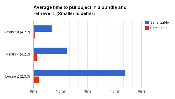 디바이스별로 Serializable과 Parcelable을 사용한 경우를 각각 비교한 그래프다. 그래프만 봐선 Parcelable의 성능이 확실히 뛰어난 것 같다. Real World에선 어떤 차이가 있을지 나온 자료는 아니지만 기억해두면 좋을 그래프 일 것 같다.