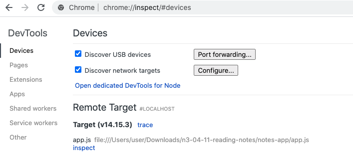 크롬 브라우저에서 chrome://inspect 주소를 쳐보면 그림 처럼 Remote Target 리스트에 현재 실행하고 있는 node js 프로세스가 보인다. inspect 버튼을 클릭해보자.